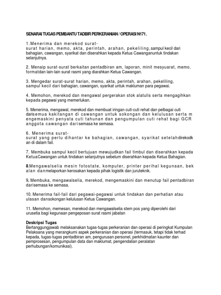 Temuduga pembantu tadbir n19 khas untuk beberapa jawatan akan berlangsung sepanjang. Ianya bukan soalan bocor atau soalan biar mereka semua tu cari soalan ramalan/bocor (ada ke?) tapi anda fokus kepada persediaan untuk jawat jawatan pembantu tadbir n19 ini. Pegawai sedang berkhidmat dalam perkhidmatan pembantu tadbir (perkeranian/ operasi), pembantu setiausaha pejabat, pembantu tadbir (kewangan), pemeriksa cap jari dan pegawai khidmat pelanggan adalah. Assalamualaikum, hari ini kami nak kongsikan dengan anda beberapa contoh soalan yang dapat membantu anda dalam exam … Jawatan kosong pembantu tadbir n19. Temuduga pembantu tadbir n19 khas untuk beberapa jawatan akan berlangsung sepanjang tahun ini. Senarai tugas, gaji dan syarat kelayakan penolong pegawai tadbir gred n29. Secara am, tugas seorang pembantu tadbir (perkeranian/operasi) n19 adalah seperti berikut: Menyelenggara ,dan mengemaskini, buku tunai kerajaan dan suwa. Senarai tugas pembantu tadbir n19. Tahniah sekiranya anda di panggil menghadiri berikut merupakan deskripsi tugas seorang pembantu tadbir n19: Jawatan pembantu tadbir gred n19 boleh dimohon menerusi borang suruhanjaya perkhidmatan awam (spa). Buat pemohon pekerjaan yang daftar semoga perkongsian ini tentang gaji, kelayakan dan tugas pembantu tadbir gred n19 membantu mereka yang ingin bekerja kakitangan kerajaan.