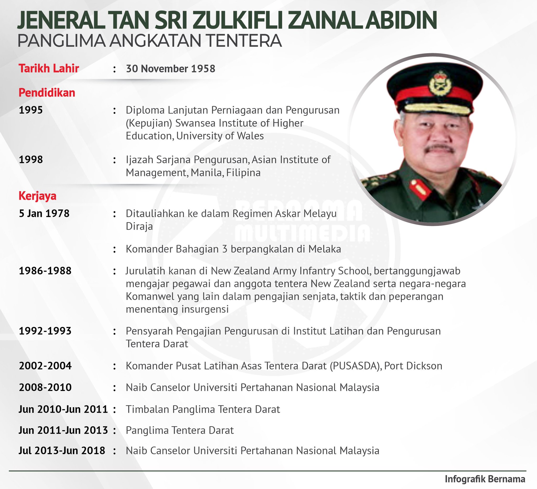 This article includes a list of general references, but it remains. Zulkifli zainal abidin, 58, a malaysian, was appointed as the chief human resources officer of sime darby plantation berhad (sdpb) on 21 november 2017 following the demerger of sime darby group and the listing of sdpb. Tan sri dato 'seri panglima hj zulkifli bin hj zainal abidin is een maleisische generaal die diende als de 20e chief of defense forces. General tan sri zulkifli zainal abidin was officially installed as malaysia's 20th armed forces chief today. Zin (born 14 june, 1954, in pasir mas) is the 18th and the current chief of malaysian armed forces.